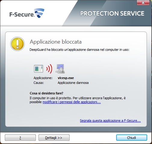 Messaggio di Avviso DeepGuard: Applicazione bloccata